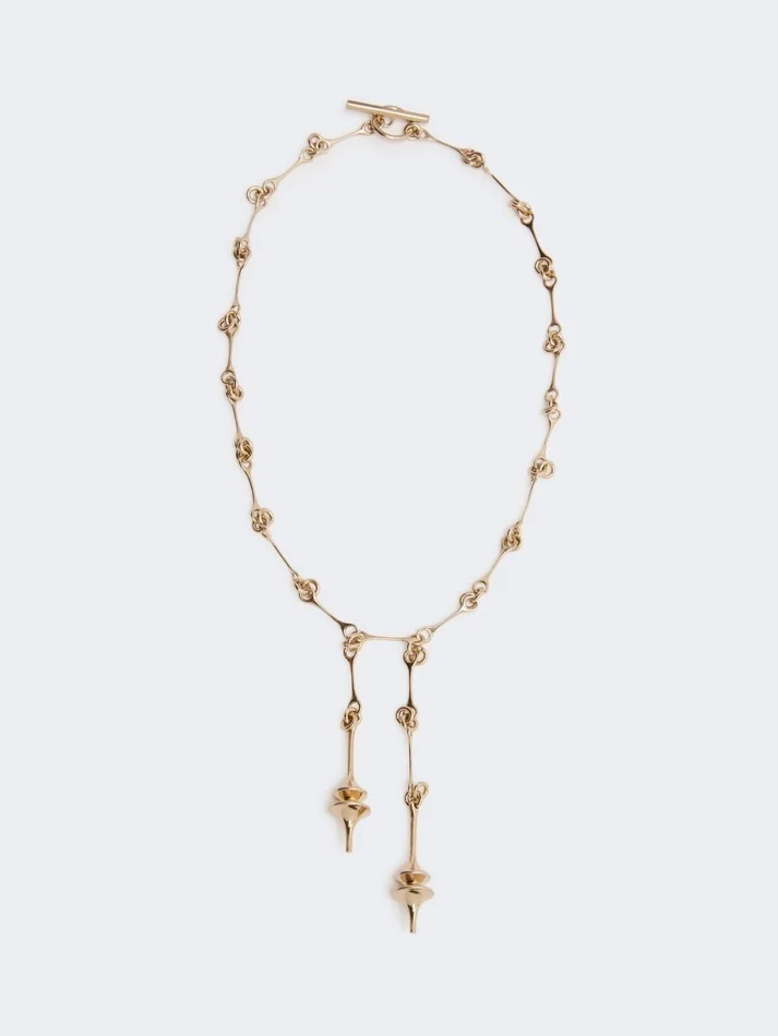 long necklace composed of linked elements and double asymmetric pendant.