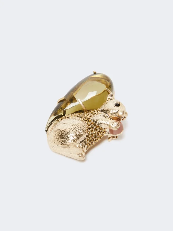 shaped brooch composed of elements set in resin and rhinestone details.