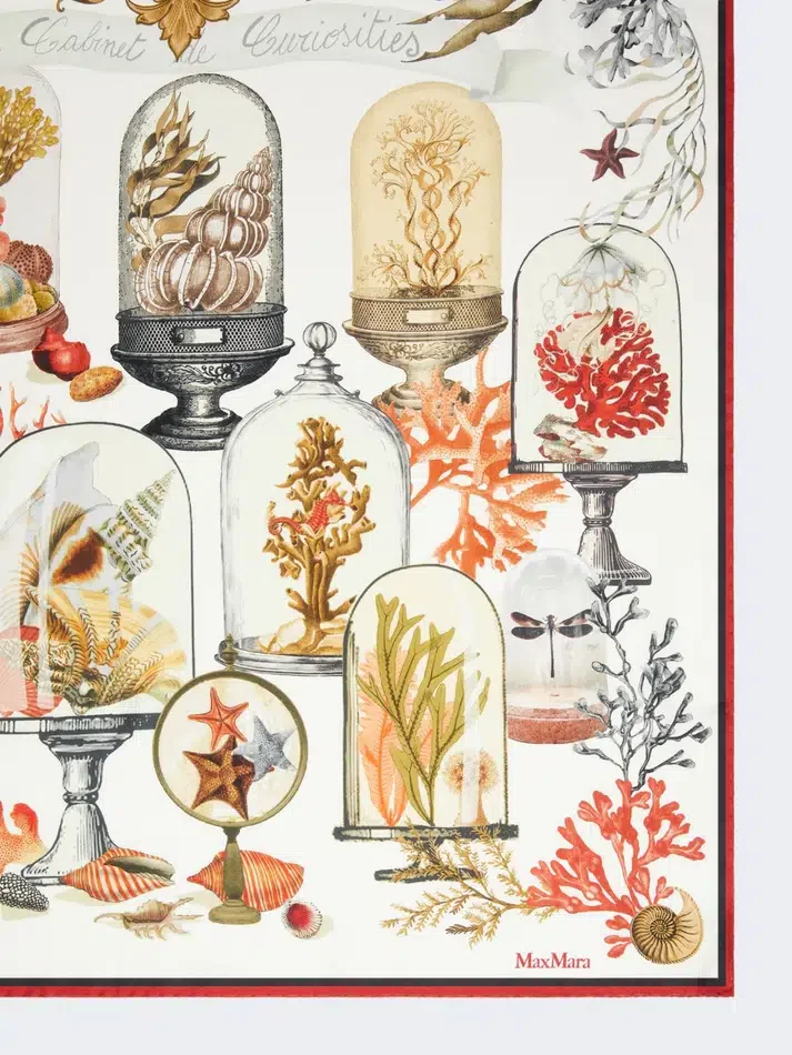 oversized square scarf with cabinets of curiosities collection motif printed all over.