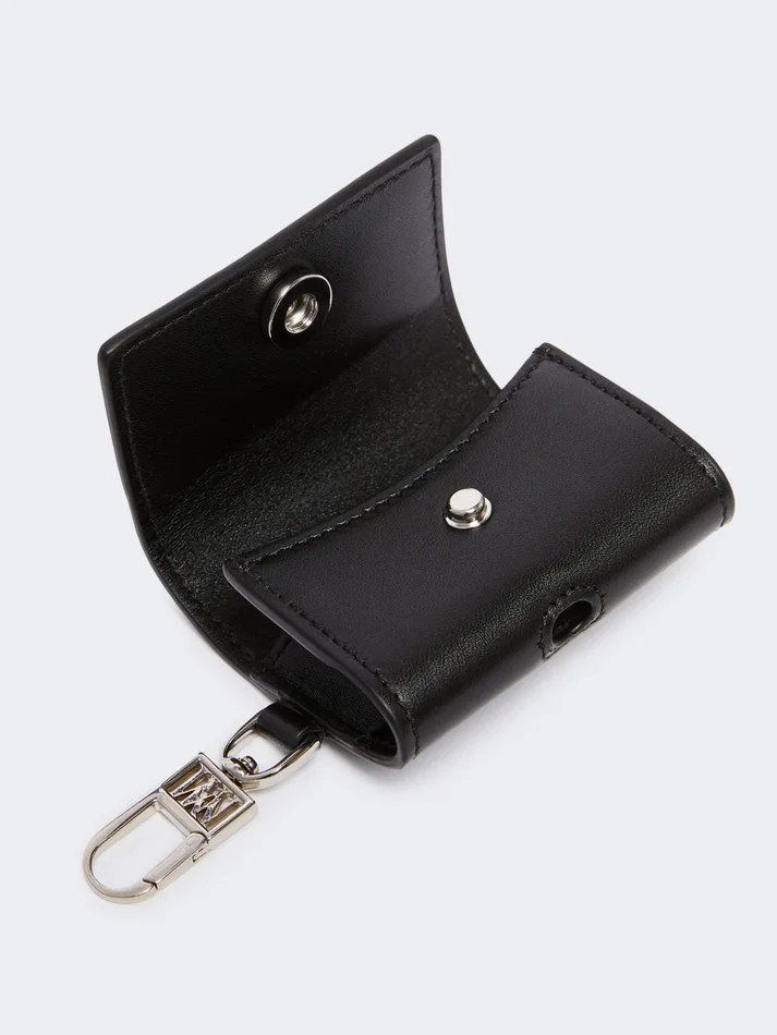 airpods pro-compatible wireless earphone case. the model comes with a small metal monogram clasp that can be attached to the mlace strap or max mara bags.