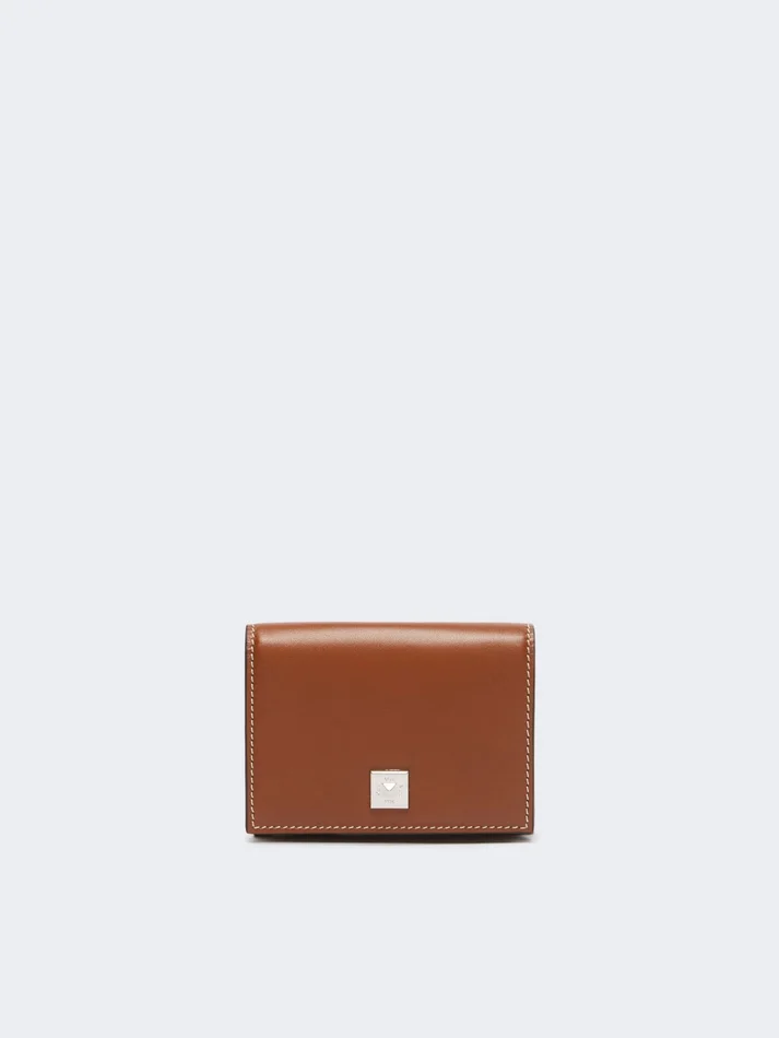 compact tri-fold wallet with max mara lettering on the back and outer coin pocket with flap and max mara-branded metal pyramid button.