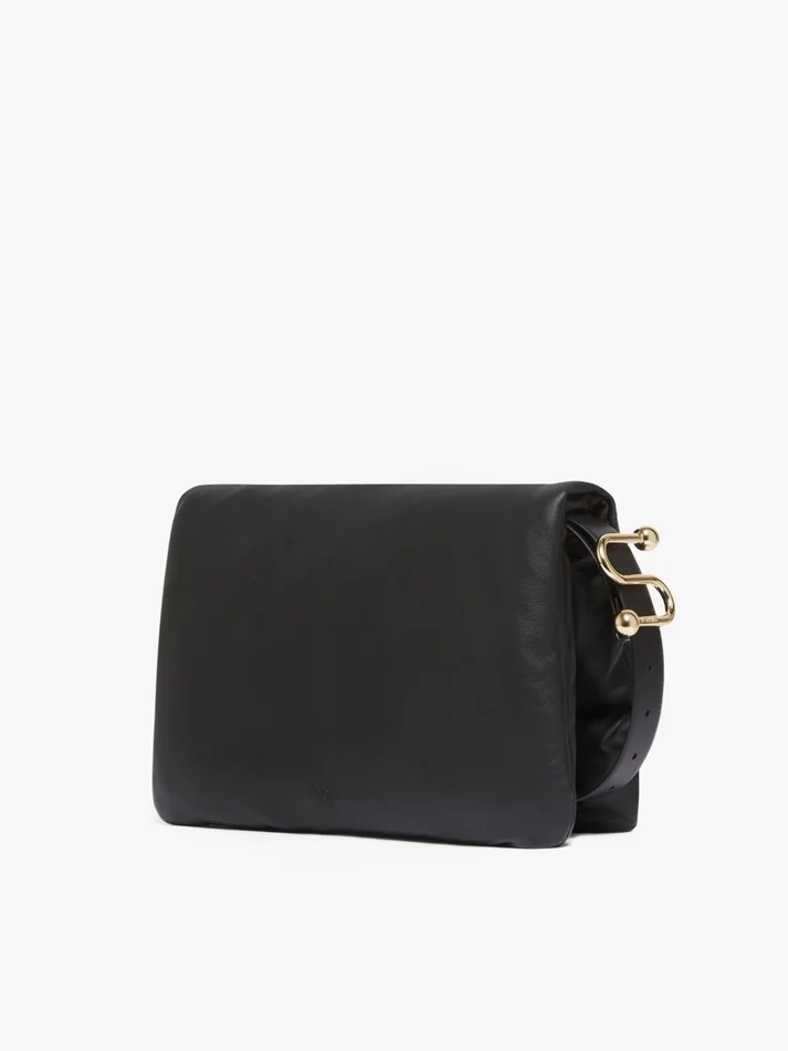 new envelope bag with flaps made of soft nappa leather with internal padding. the flap closes with a magnetic button, while the adjustable and removable shoulder strap features an s-shaped metal buckle. can be worn as a pouch, over the shoulder or across the body.