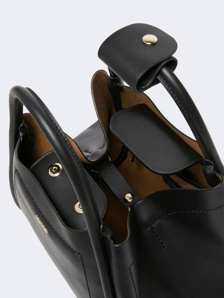 round marine handbag with flexible volume thanks to foldable sides. includes an internal strap and rings for attaching charms and pouches (sold separately).