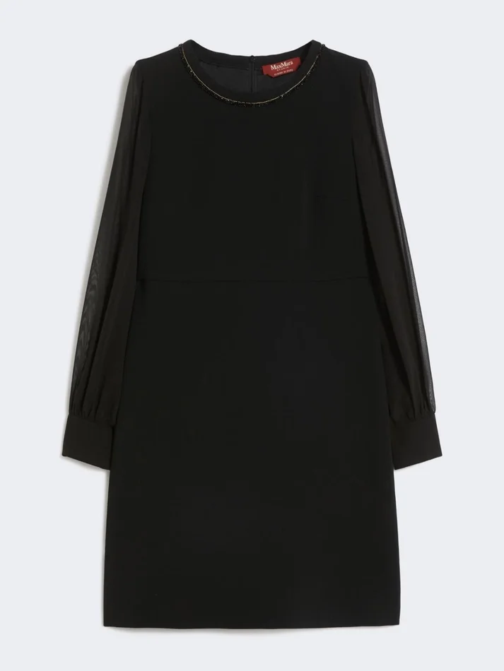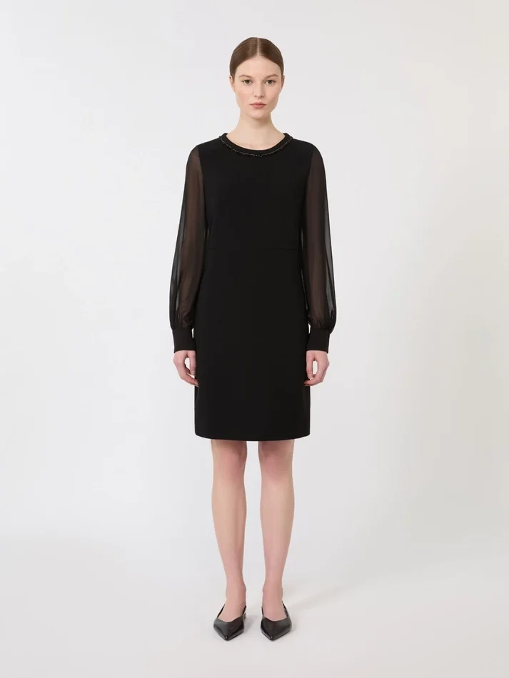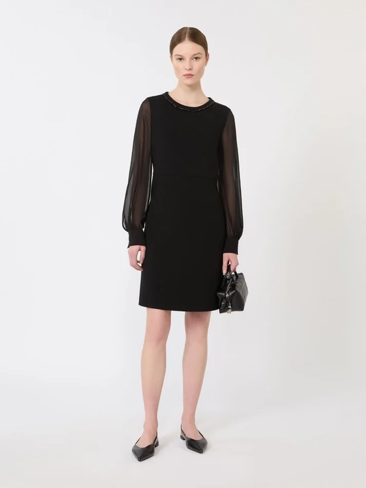 short cocktail dress, embellished by piping embroidered with beads on the neckline.