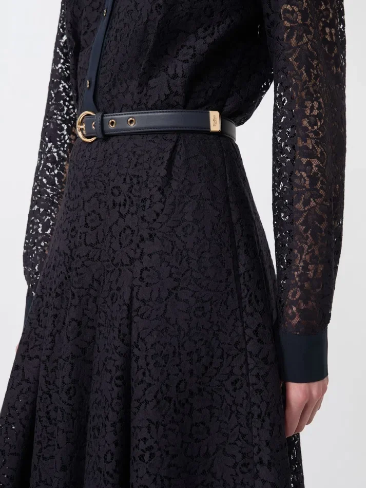 - flared line with cut and belt at the waist