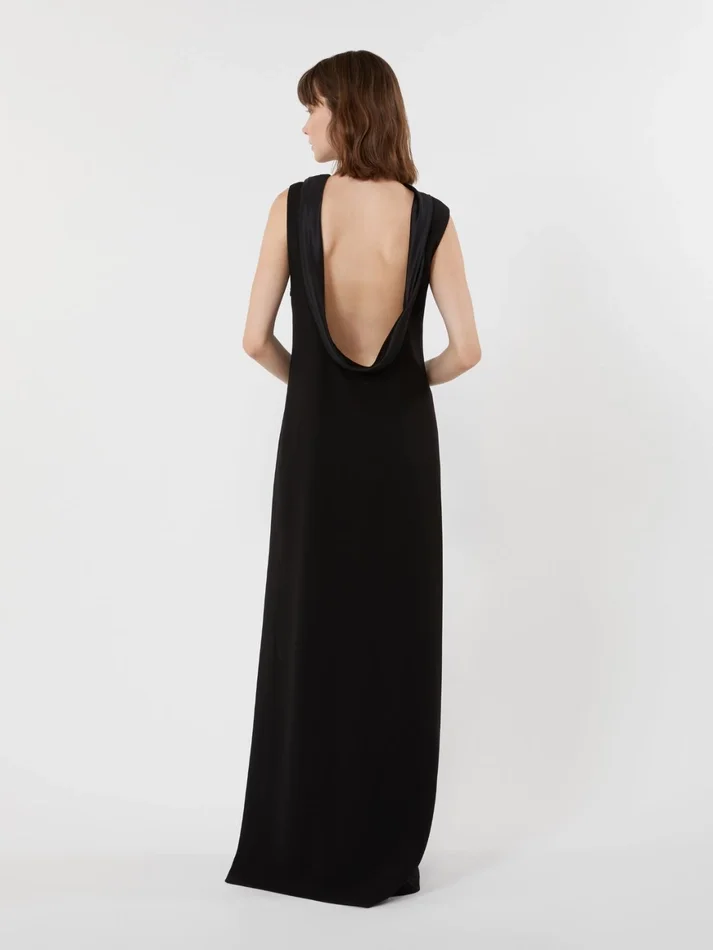 long sleeveless dress featuring a deep cowl rear neckline that frames the back with its fluid, feminine cut.