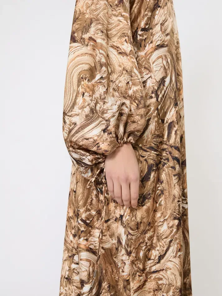 long dress with a flowing silhouette and a collar embroidered with rhinestones and cameo stones