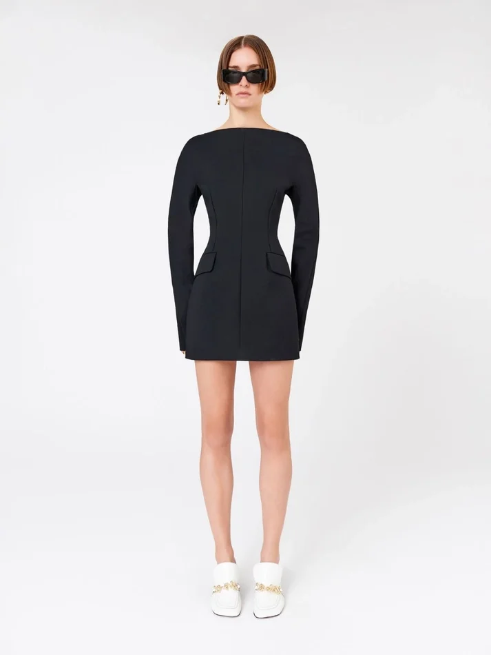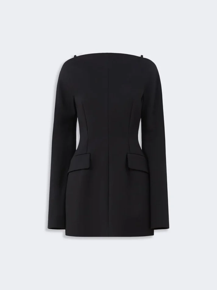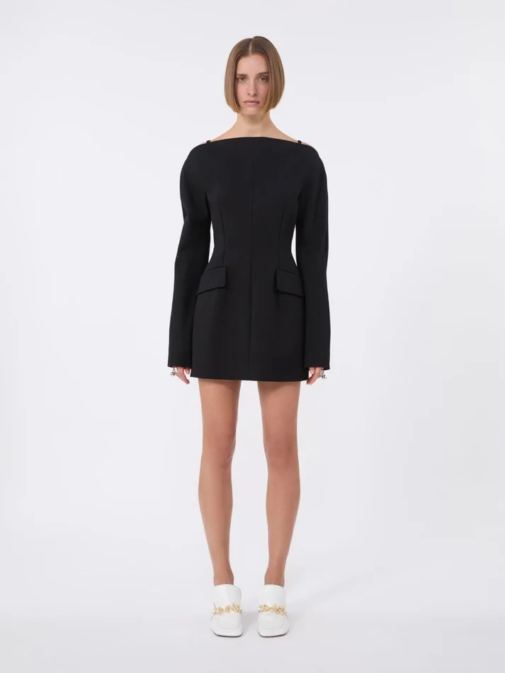 long-sleeved dress with an hourglass silhouette, made of cotton double cady. the central seams and deep darts accentuate the silhouette, with rounded hips and flap pockets. the straight neckline that continues over the shoulders, with small fabric shoulder straps.
