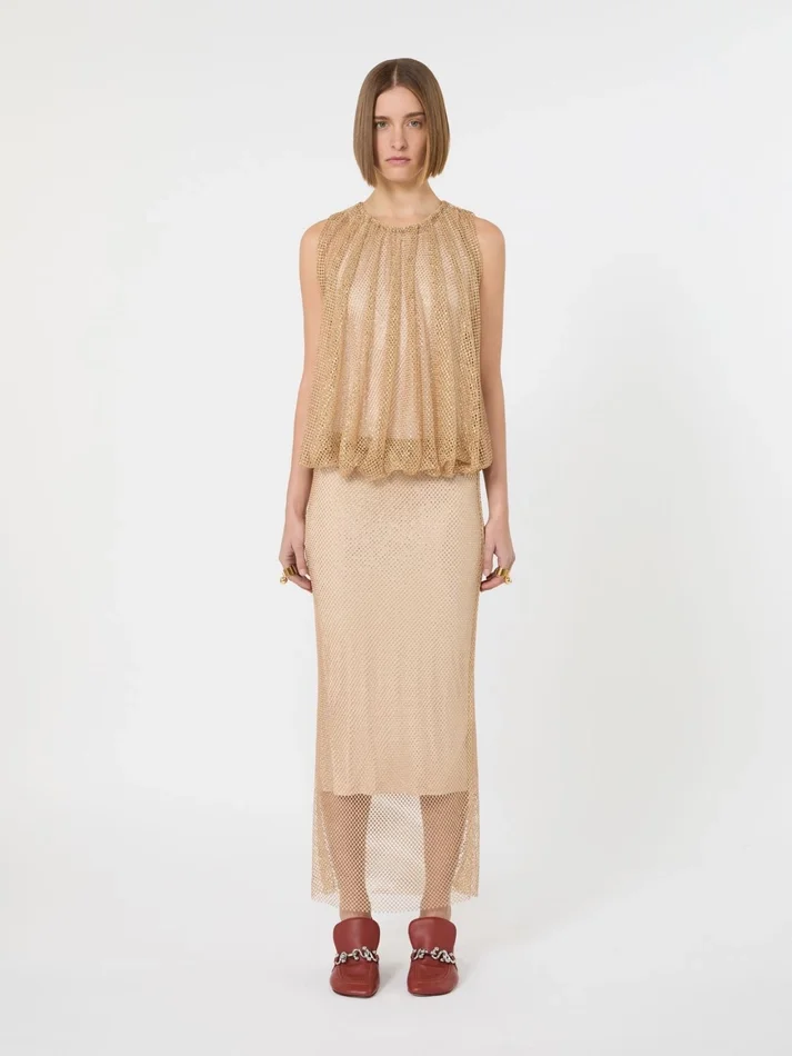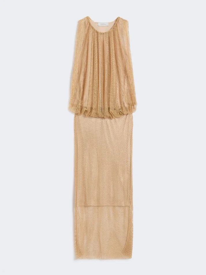 mesh dress with rhinestones applied all over for a sparkling effect. sleeveless, with a soft top, it is completed with a matching tank-top style jersey slip.