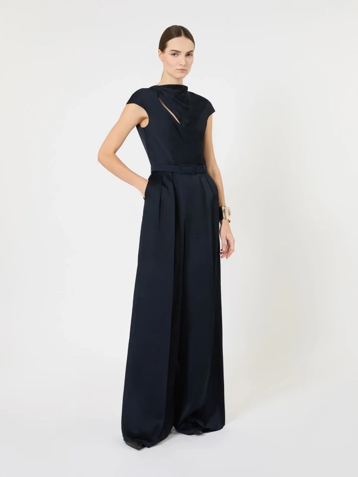 sleeveless jumpsuit comprising wide-fit trousers and a draped bodice with slanted cut-out detail on the front.