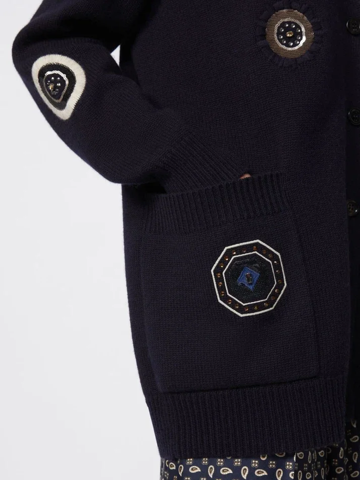 stockinette-stitched long cardigan embellished with thread, sequin and rhinestone-embroidered detail.
