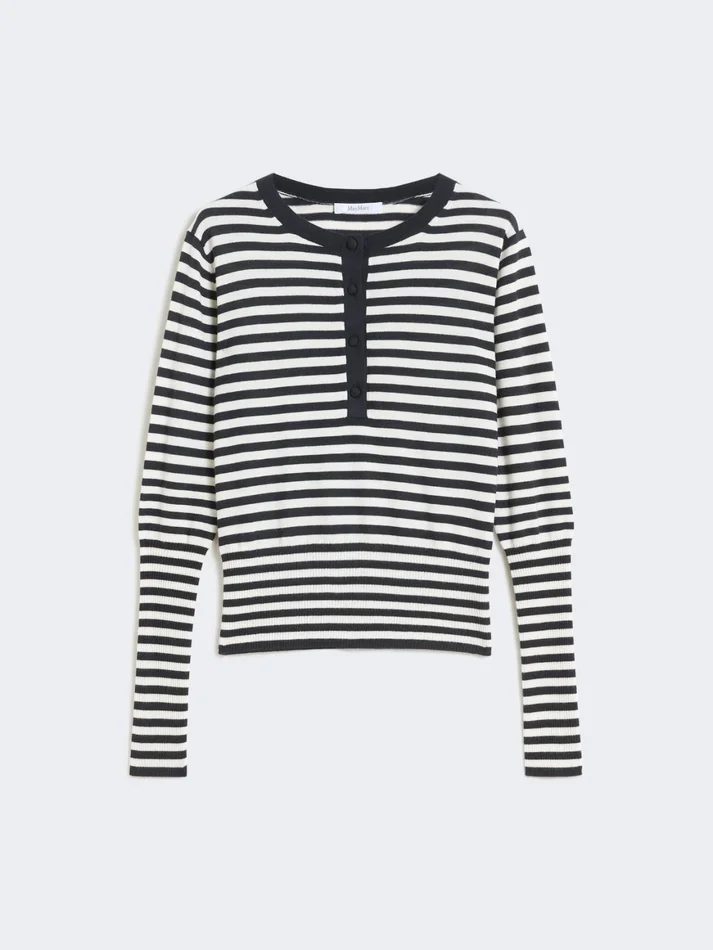 - crew-neck with 4 knit fabric-covered buttons on the front