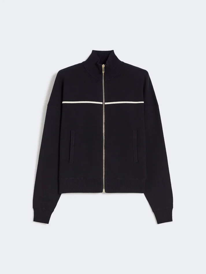cropped cardigan with a yoke seam finished with contrasting flat piping on the front and back.