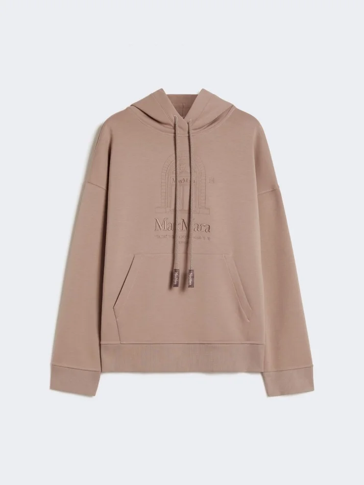 drawstring hood-adorned sweatshirt with graphic embroidered detail on the front.