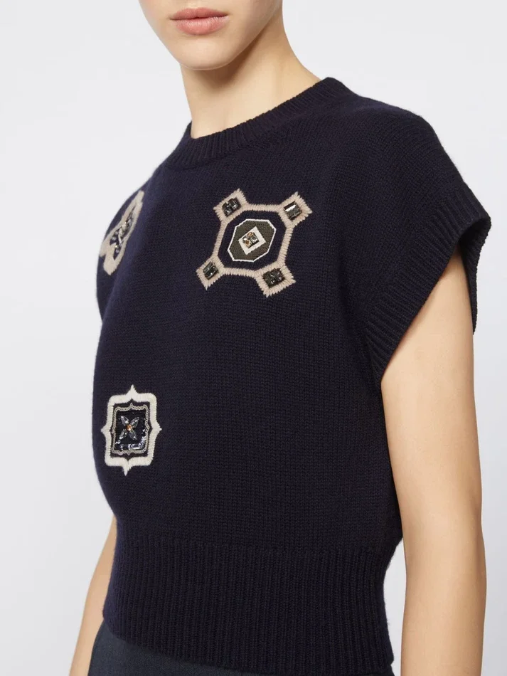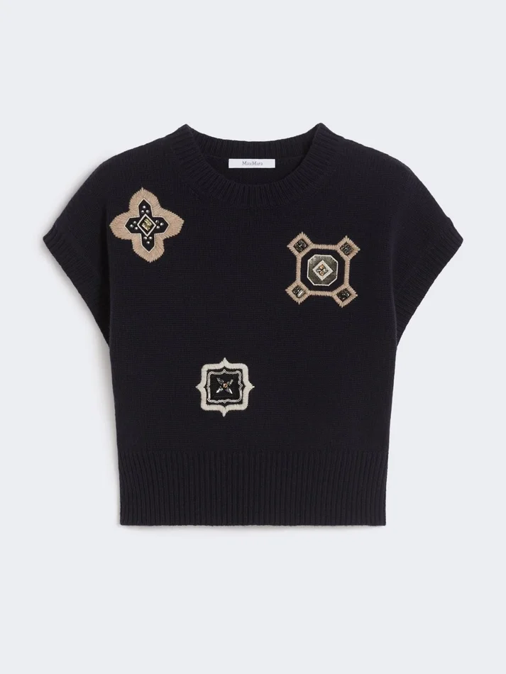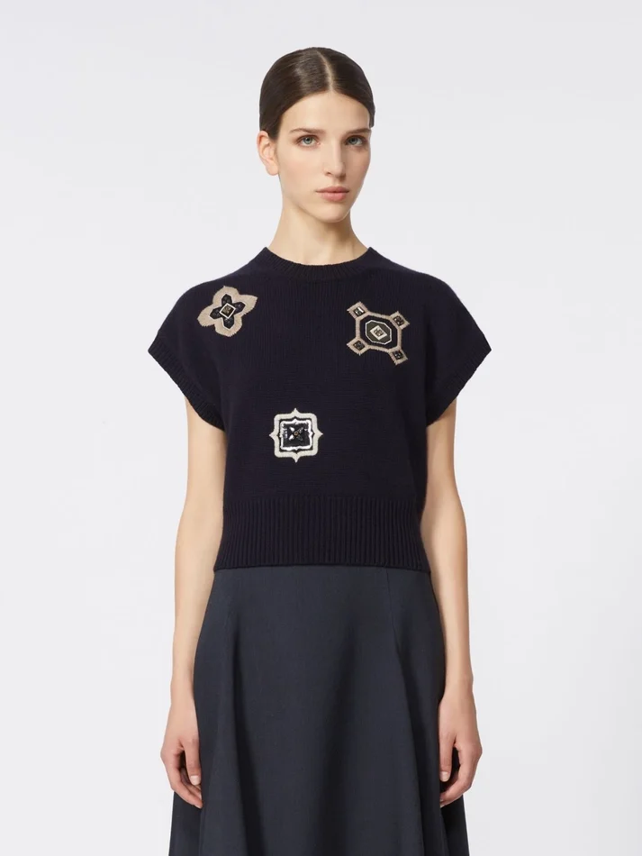 cropped sweater decorated with sequin and rhinestone-embroidered detail.