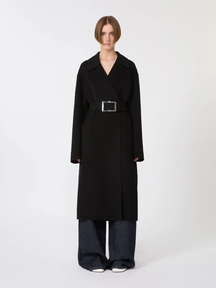 long wrap coat, crafted in soft double-face pure wool. the wide lapel and the belt at the waist with metal buckle highlight the feminine look, which is completed by maxi patch pockets for touch of functionality.