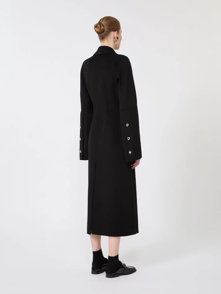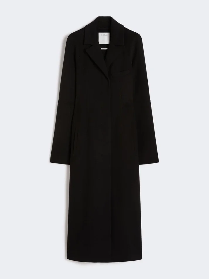 long and feminine, the pure wool double cloth coat features an hourglass-shaped silhouette. flared sleeves and concealed buttons complete a piece with sartorial flair.