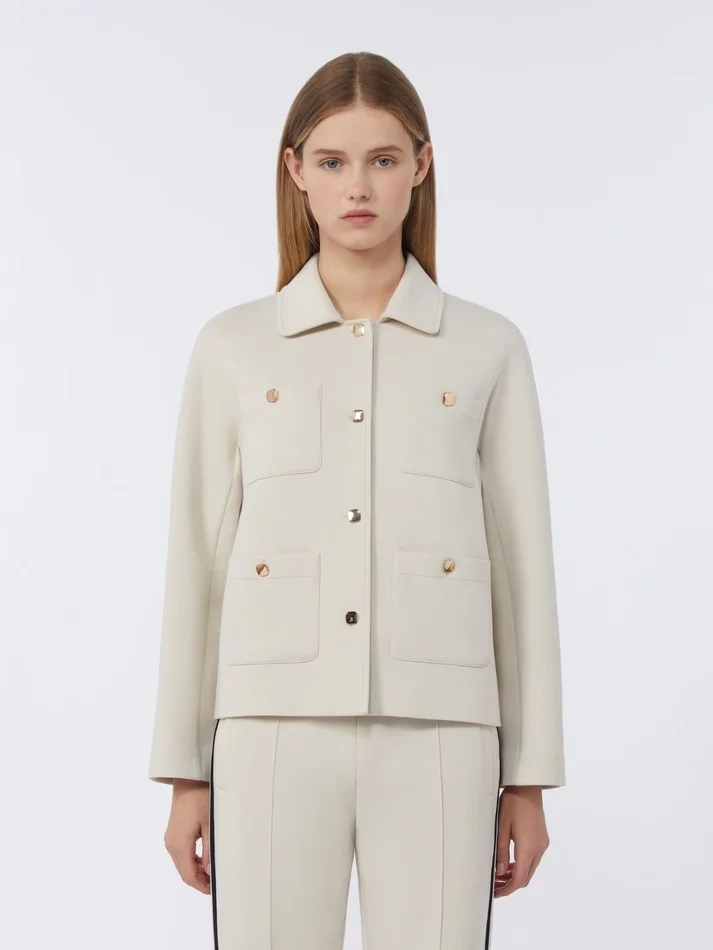 cropped jacket featuring four patch pockets with metallic buttons on the front.