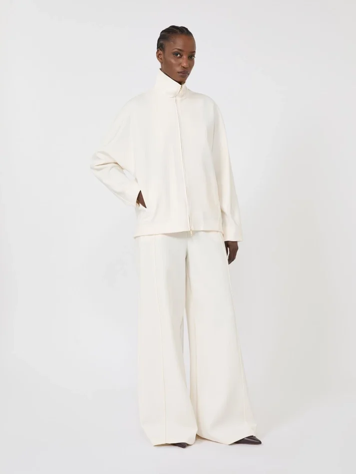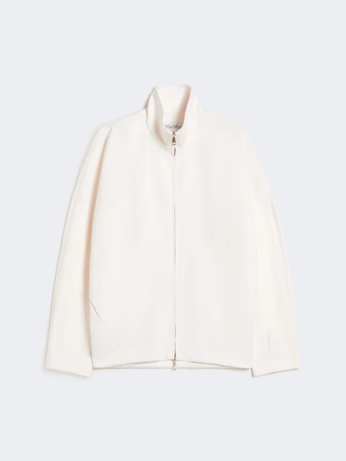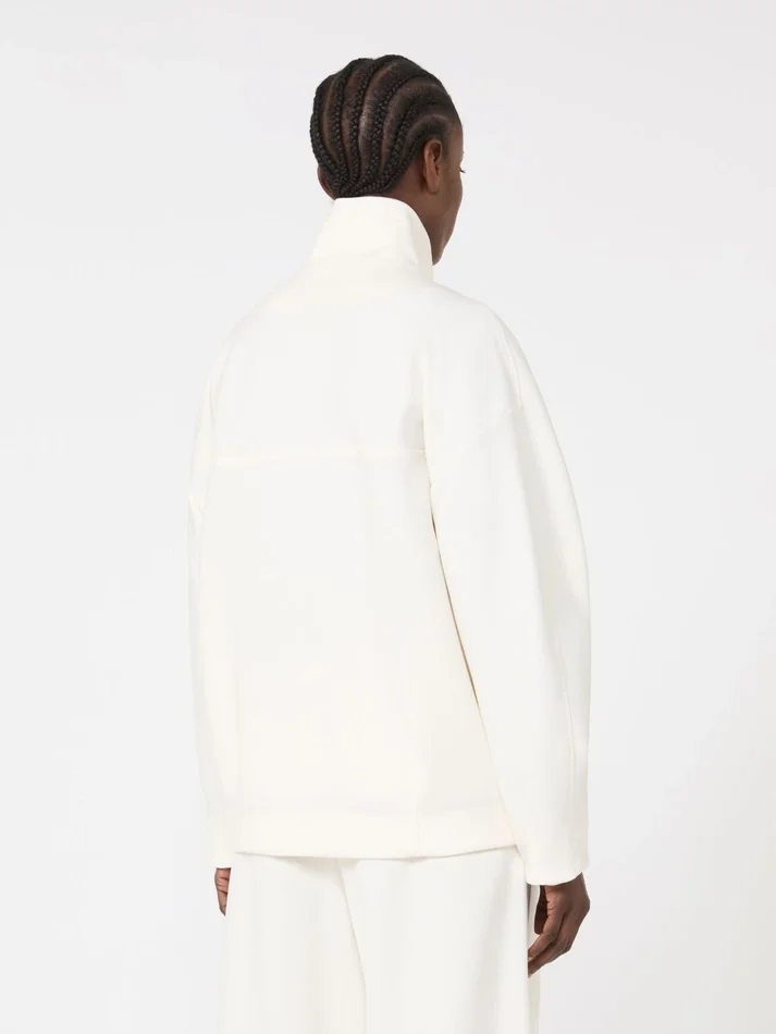 boxy jacket with high neck, featuring a side slits motif that runs towards the front, increasing the cocoon volume.