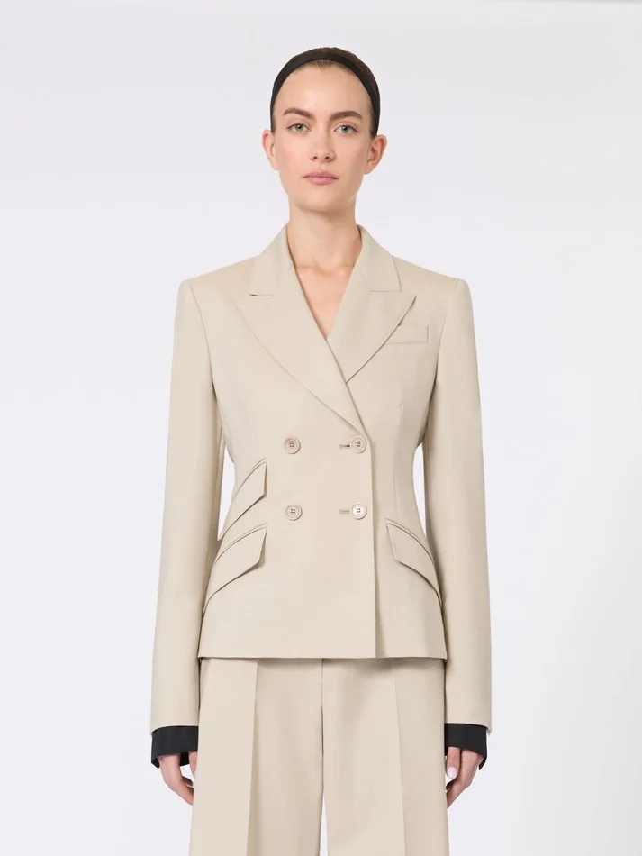 double-breasted blazer with a fitted silhouette, finished with a tailored pick stitch.