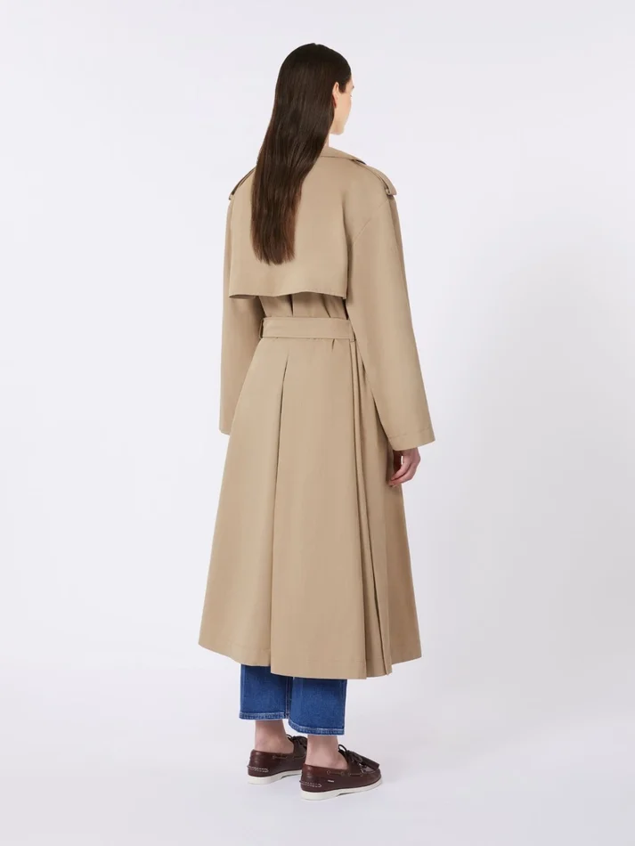 feminine-fit double-breasted trench coat featuring a flared hem cut and silhouette-accentuating matching belt.
