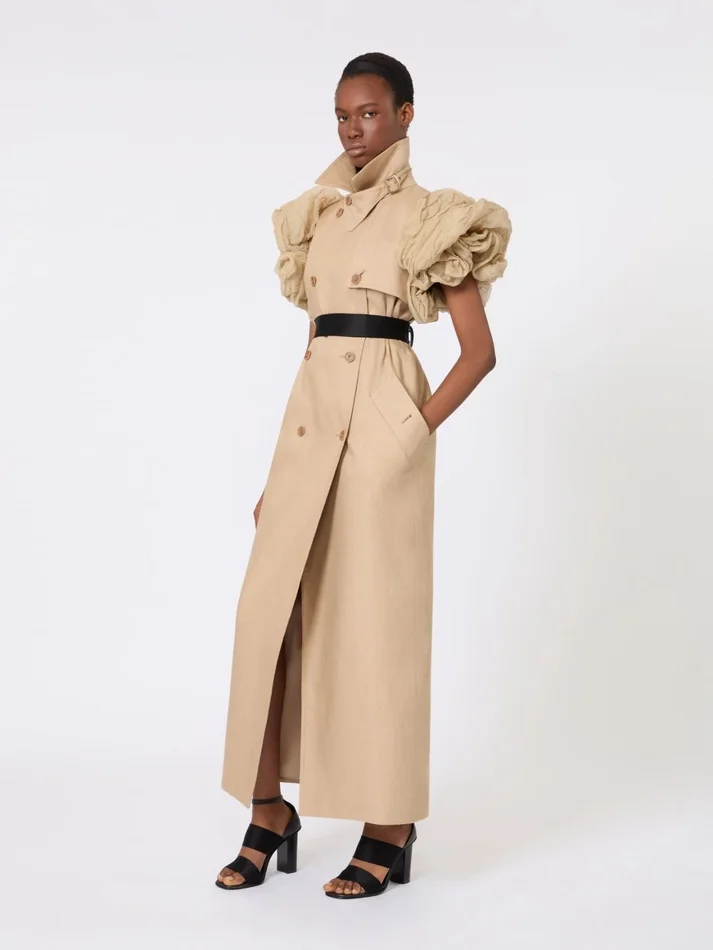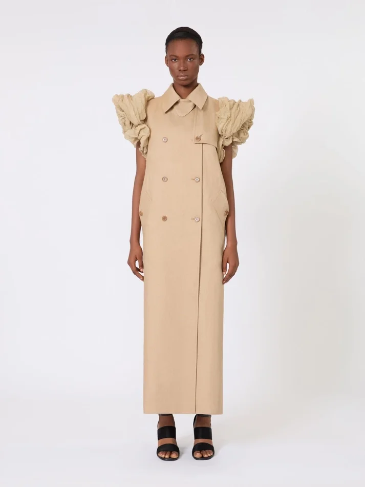 long sleeveless duster coat, featuring cotton organza, lurex and silk ruffles at the armholes.