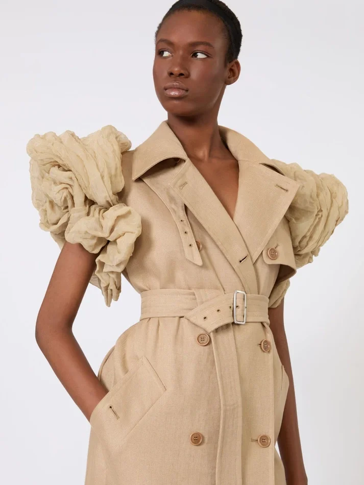 Be the first to review “Sleeveless duster coat in linen basketweave with ruffles, camel”