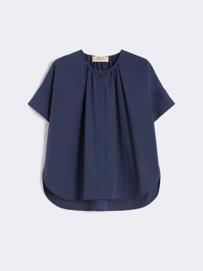short-sleeved shirt featuring a gathered motif on the front and back of the neck.
