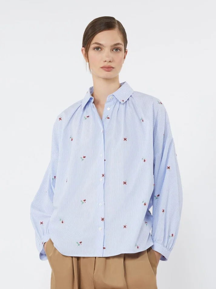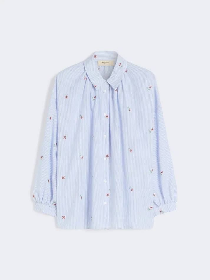 shirt with puffed sleeves, finished with small all-over embroidery and gathered details on the collar and cuffs.