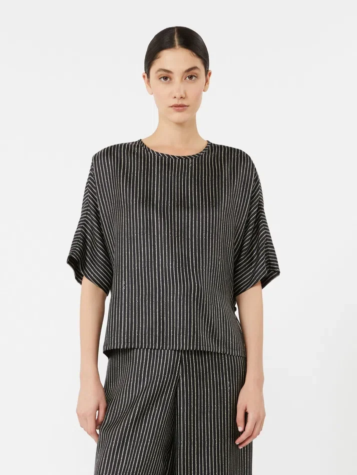 t-shirt-style blouse featuring a rear waist drawstring and tubular side ties, complete with geometric details.