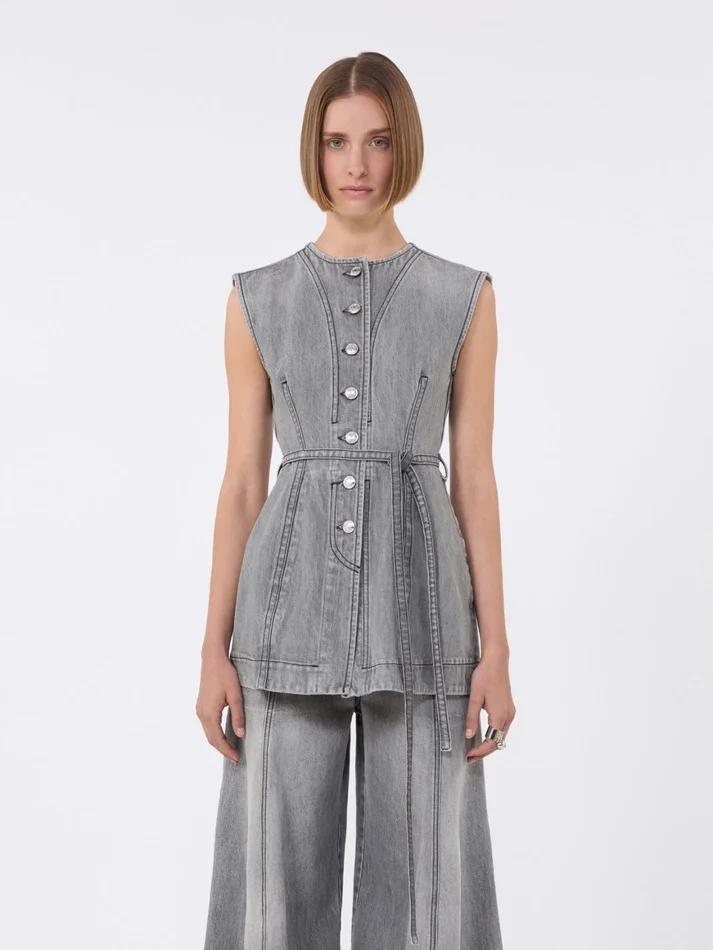 sleeveless top crafted from authentic black denim, featuring customised tack buttons and s-rivets. matching stitching highlights all the seams, with deep darts defining the silhouette. belt to tie at the waist.