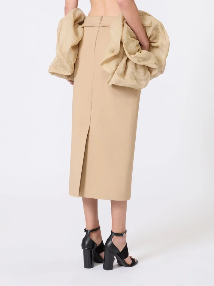 knit pencil skirt with silk, lurex and cotton organza ruffle motif at the waist.