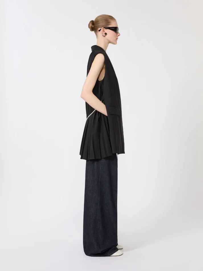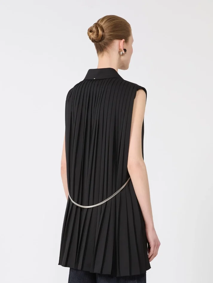 sleeveless blazer with tailored construction, in stretch gabardine wool for a formal look. the double-breasted design with concealed buttons keeps the design clean, while the pleated back with removable metal belt adds an original detail.