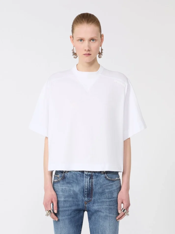 a contemporary evolution of the boxy t-shirt, designed with an original crater neck emphasised by the ribbed insert. the fit is straight over the torso with small on-tone logo printed on the left shoulder.