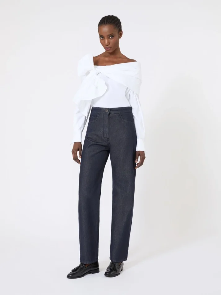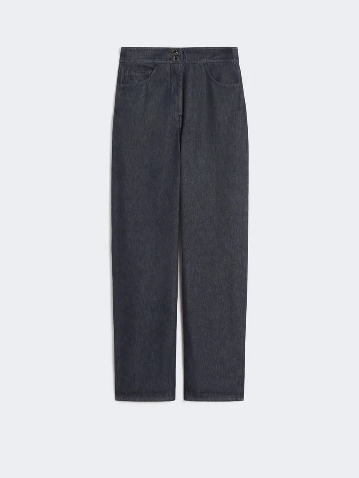 five-pocket trousers, featuring a high waist and straight-leg silhouette.
