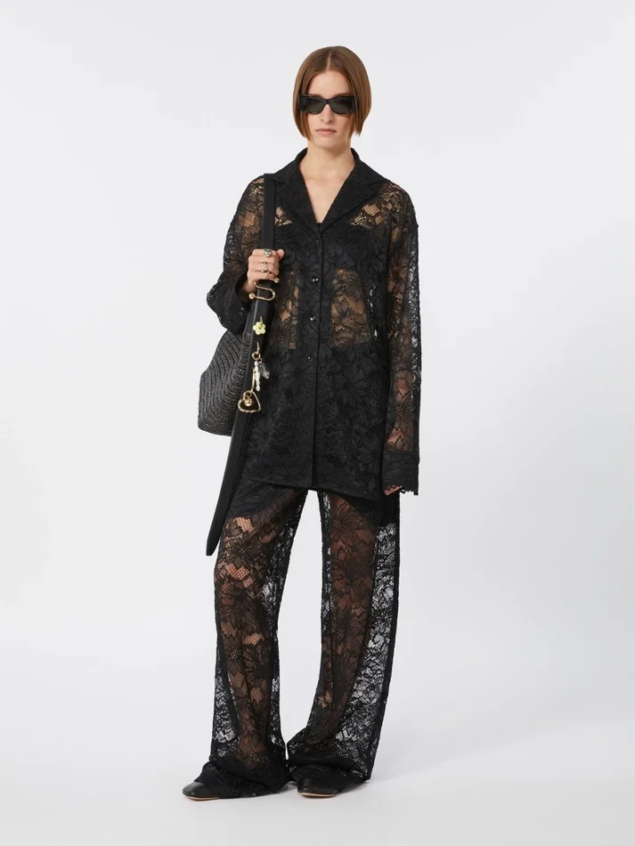 lace trousers with a rebroda floral pattern. the model boasts a straight leg, slim-cut waist, mannish-style pockets and a branded internal waistband. style lined to below the hips.
