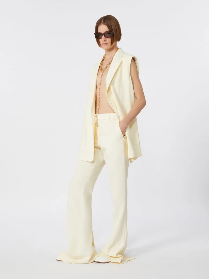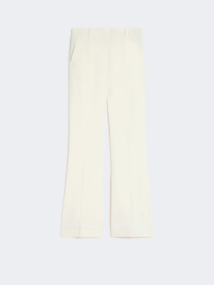 flared trousers with a slim fit and feminine cut. the construction is inspired by tailored styles, with covered lacing and trouser crease. the small overlapping rear slit further flares the leg.