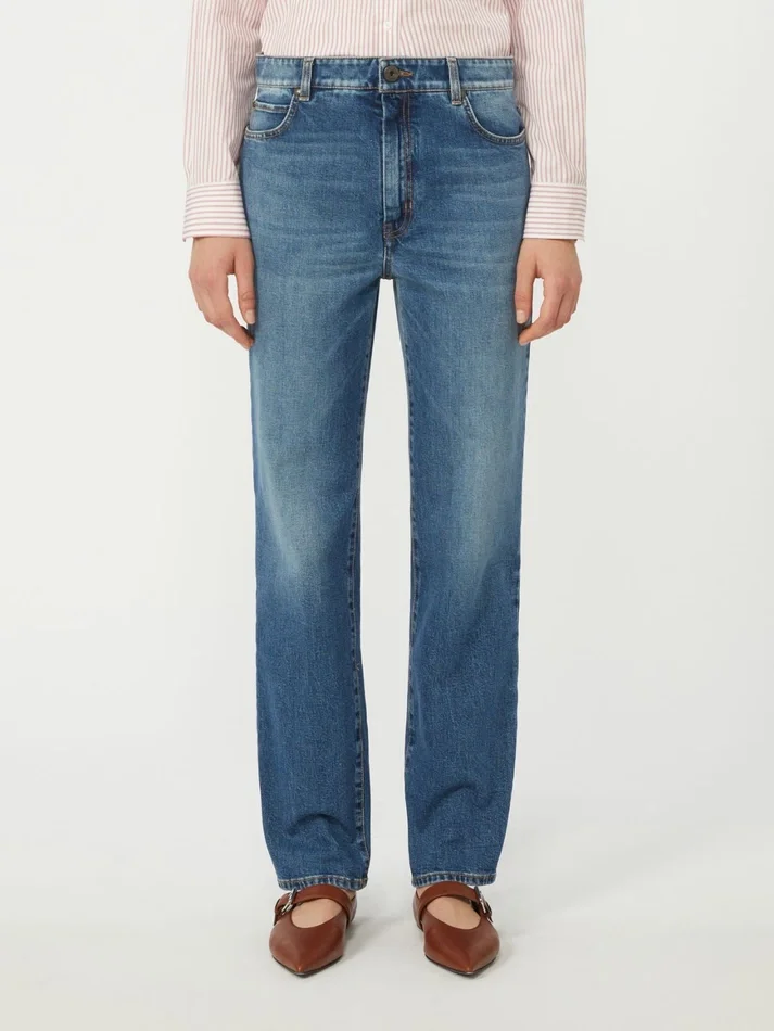 five-pocket straight-leg jeans, customised with a logo label on the waist back.